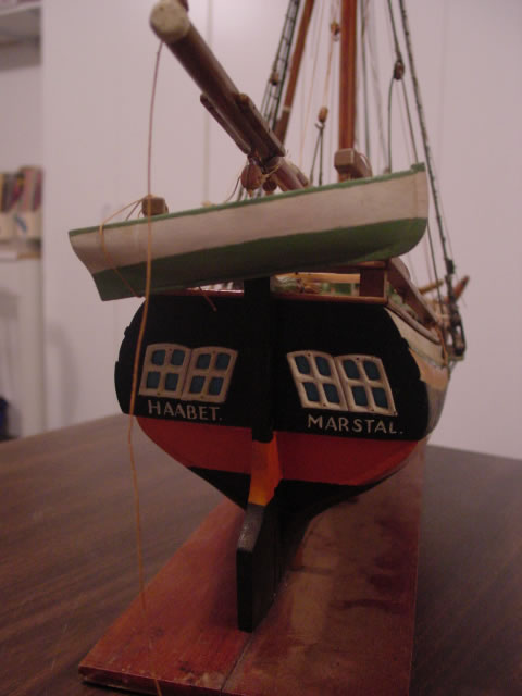 The only writing on the ship or base is the name on the stern. I have been told that "Haabet" is Danish for "Hope" and "Marstal" is a city in Denmark.