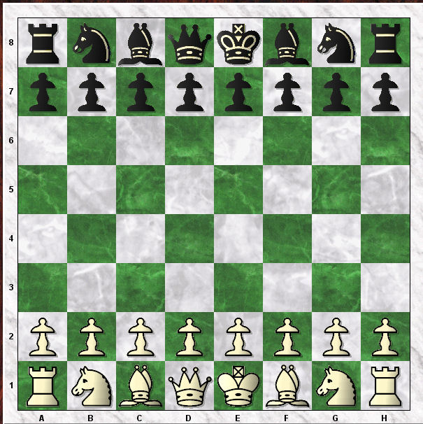 As you can see along the bottom of the board there are the letters a-h, and along the side are the numbers 1-8. so a coordinate is listed Letter-Number. Such as the white king is on e1 and the black queen is on d8. a move is then listed as Piece-Letter-Number And the pieces are by the first letter of the name of the piece. The exception is knights which are represented by N. So a knight moving to f3 would be Nf3. Also pawns are just listed as the square they would move to. So a pawn going to e4 would be e4. When capturing you write piece x square. Square being where the piece captured. so a bishop taking the knight on d5 would be Bxd5. Pawns capturing are written as letter of the square moving from x square moving to. So pawn taking d5 from e4 would be exd5 The one move thats written difrerently is castling. It is written 0-0 if you are castling on the kings side and 0-0-0 If you're castling queenside. Also before each move is listed the move number. Note that one move is whites turn and blacks turn. For example here are the first three moves of one of my games... 1. e4 c5 2. Nc3 Nc6 3. f4 Nf6 A last note - Moves thought smart have an ! after them and questionable moves have a ? The Opening Your first move of the Game is one of the most